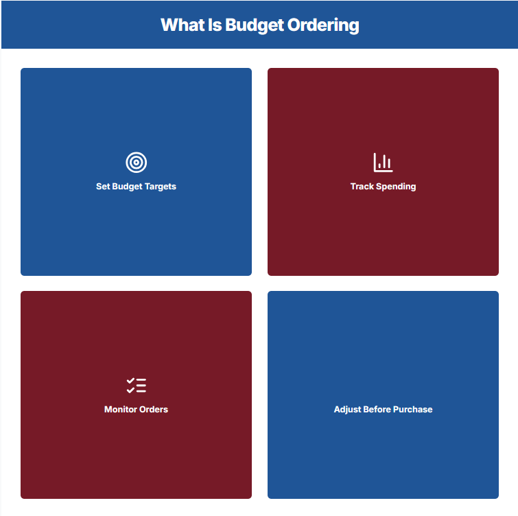 Budget ordering is the process of setting spending targets for purchasing and monitoring orders against those targets in real time.
