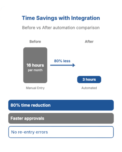 • Integration reduces errors, speeds up approvals, and simplifies accounting exports.